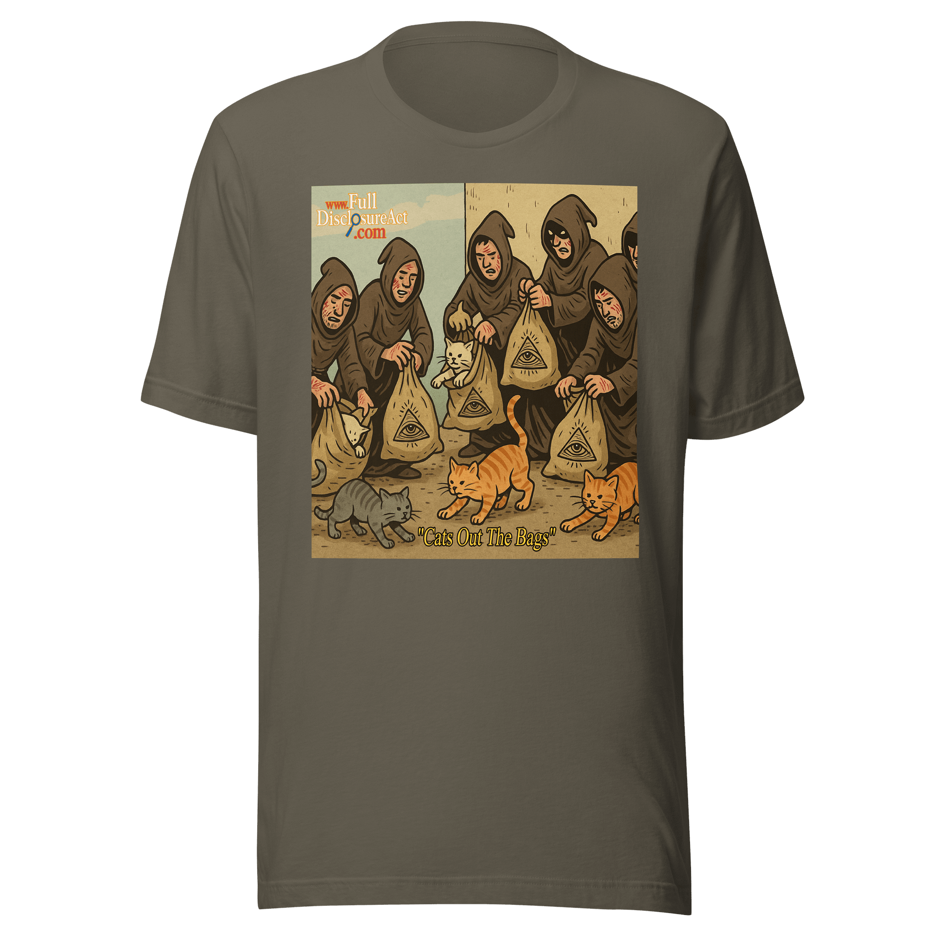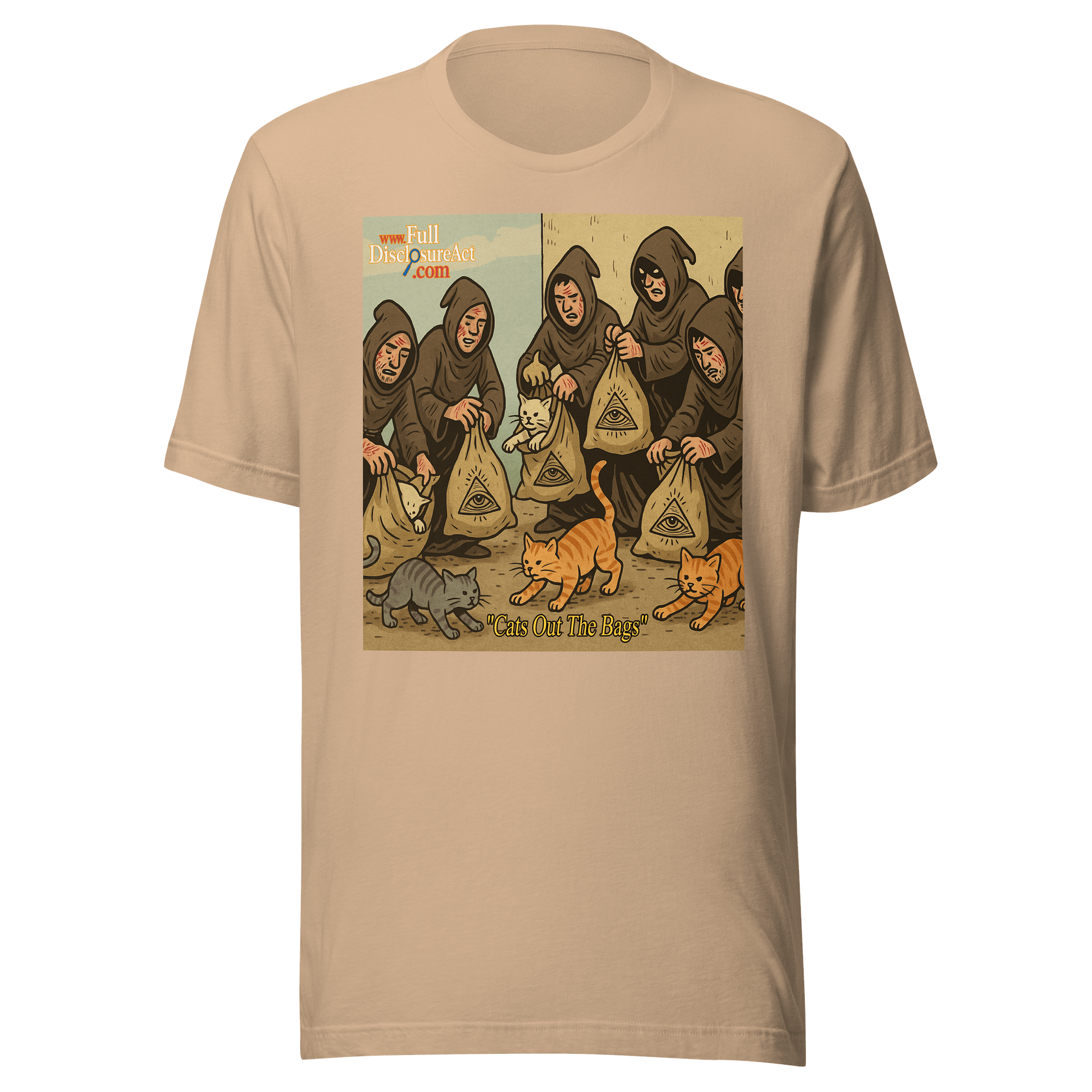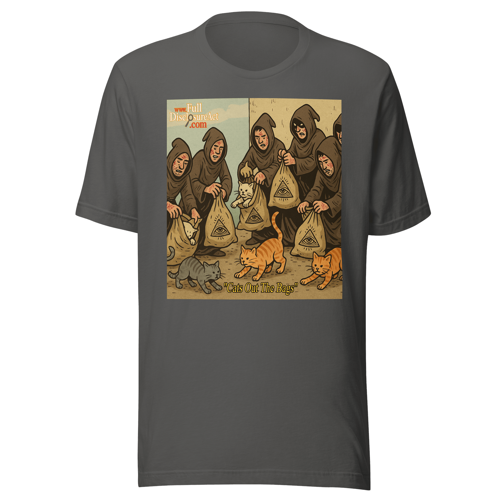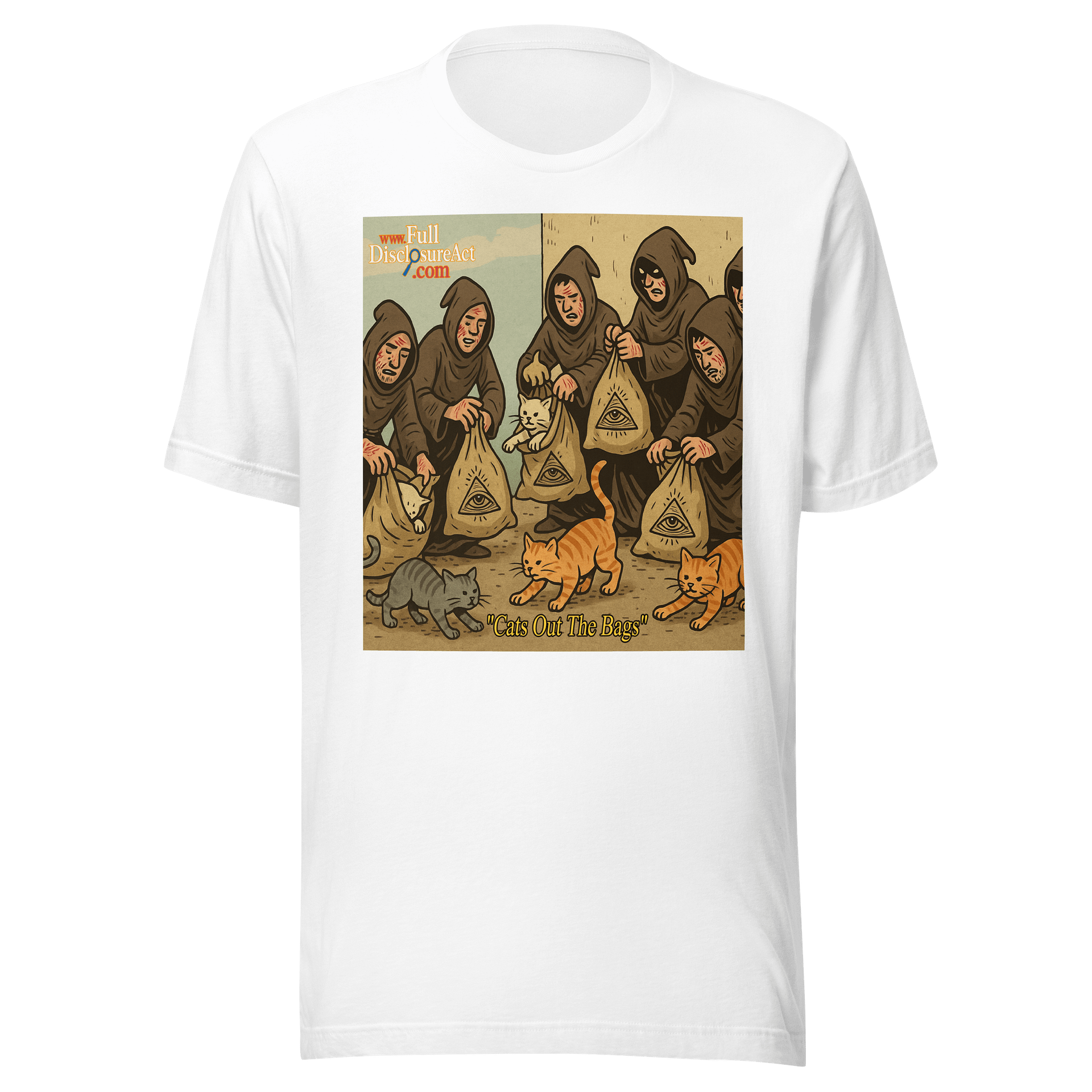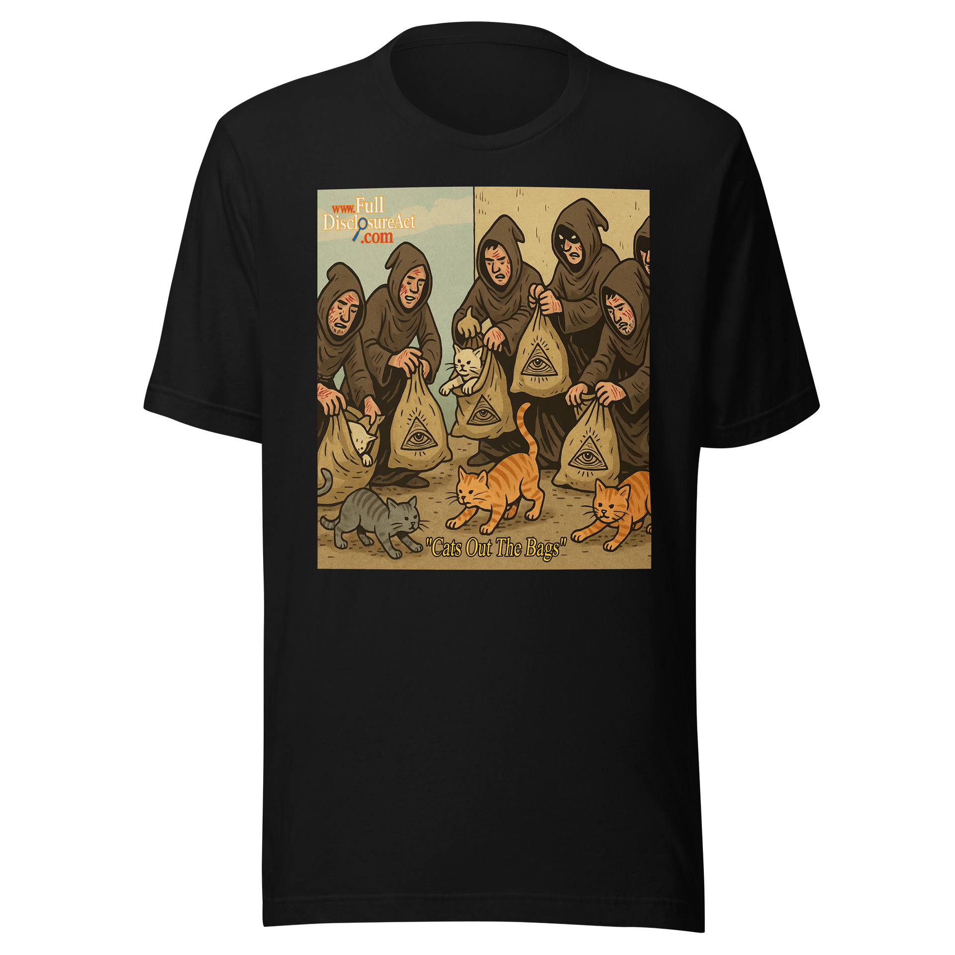 Watch as the felines of freedom claw their way out of secrecy—one Illuminati bag at a time. Whether you’re exposing secrets, dodging hooded weirdos, or just love cats with attitude, this shirt says it all: the cat’s out, and so is the truth.