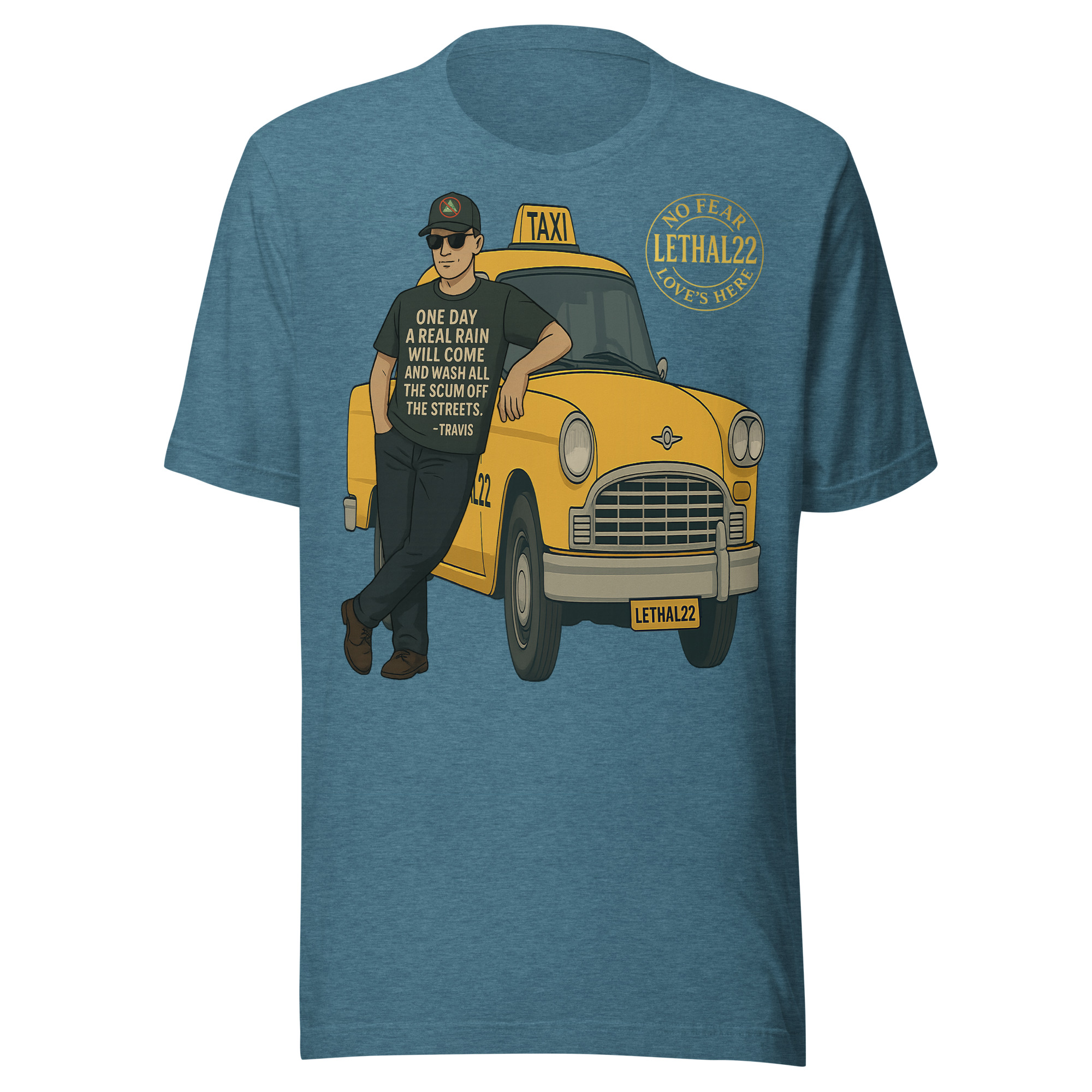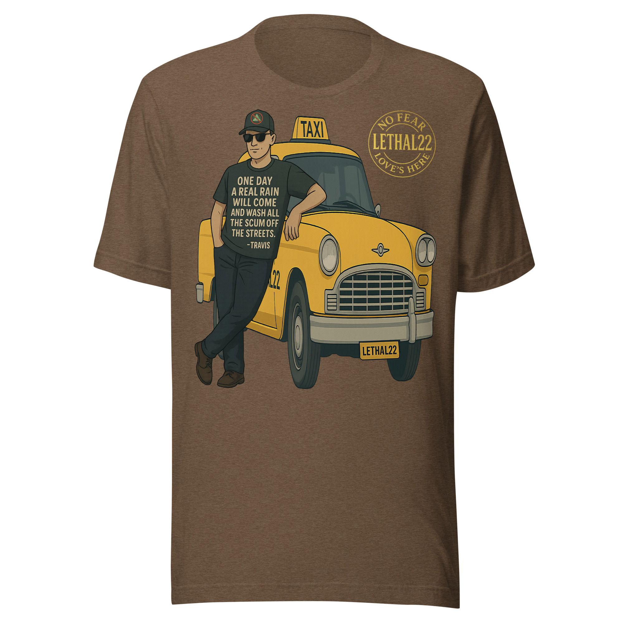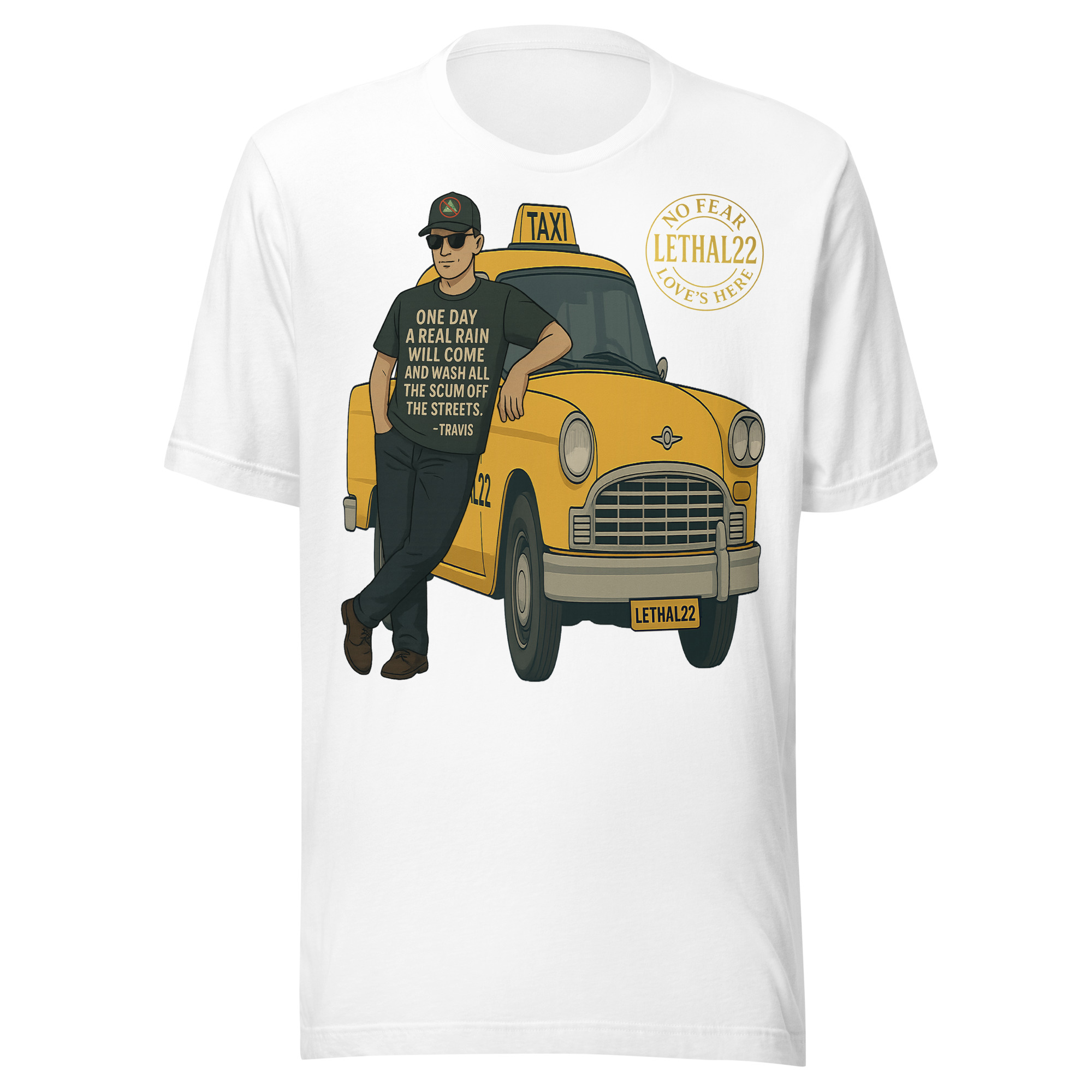 This shirt is a quiet nod to the moment when frustration turns into clarity—and clarity turns into resolve. A lone figure. A yellow taxi. A city that feels overdue for a cleansing storm.