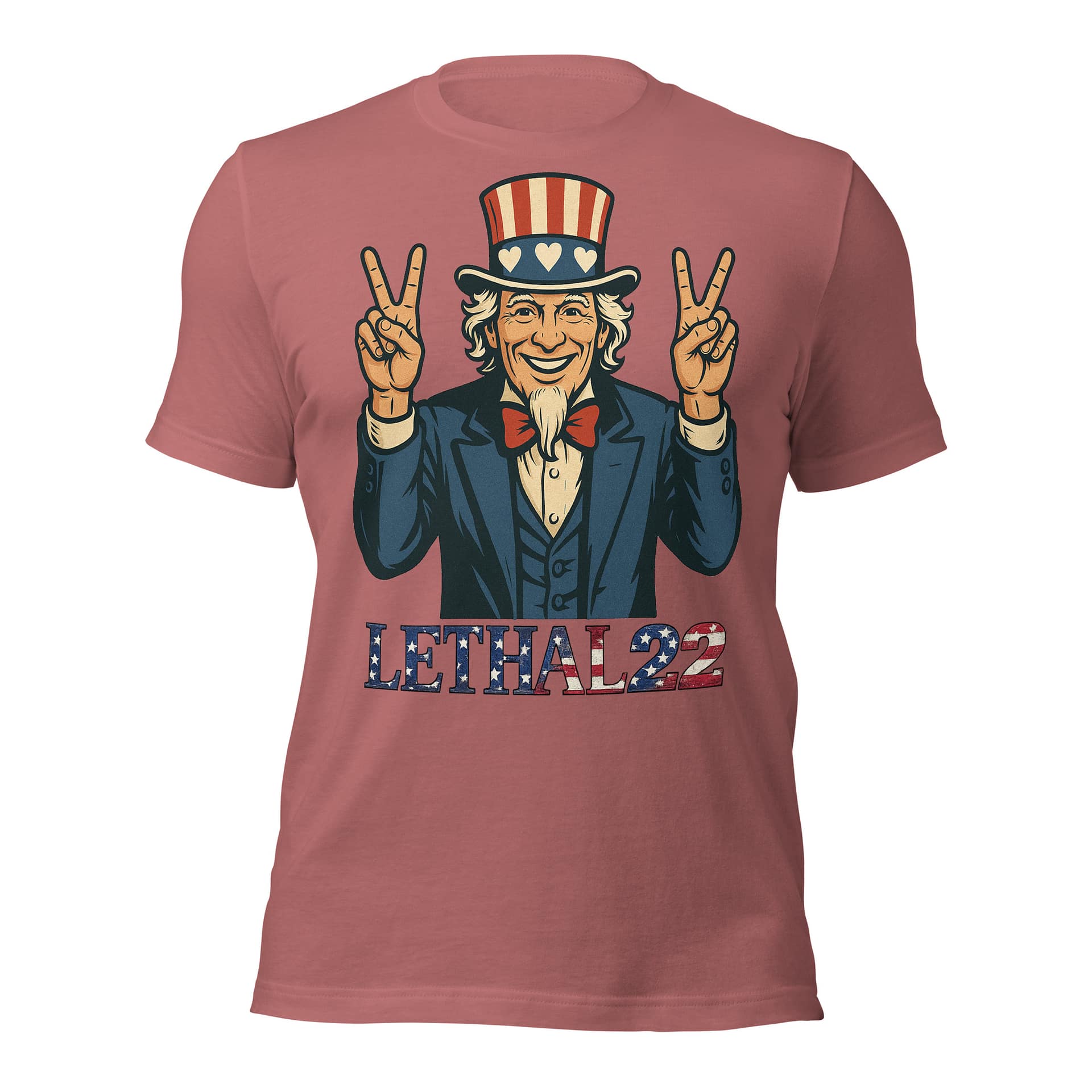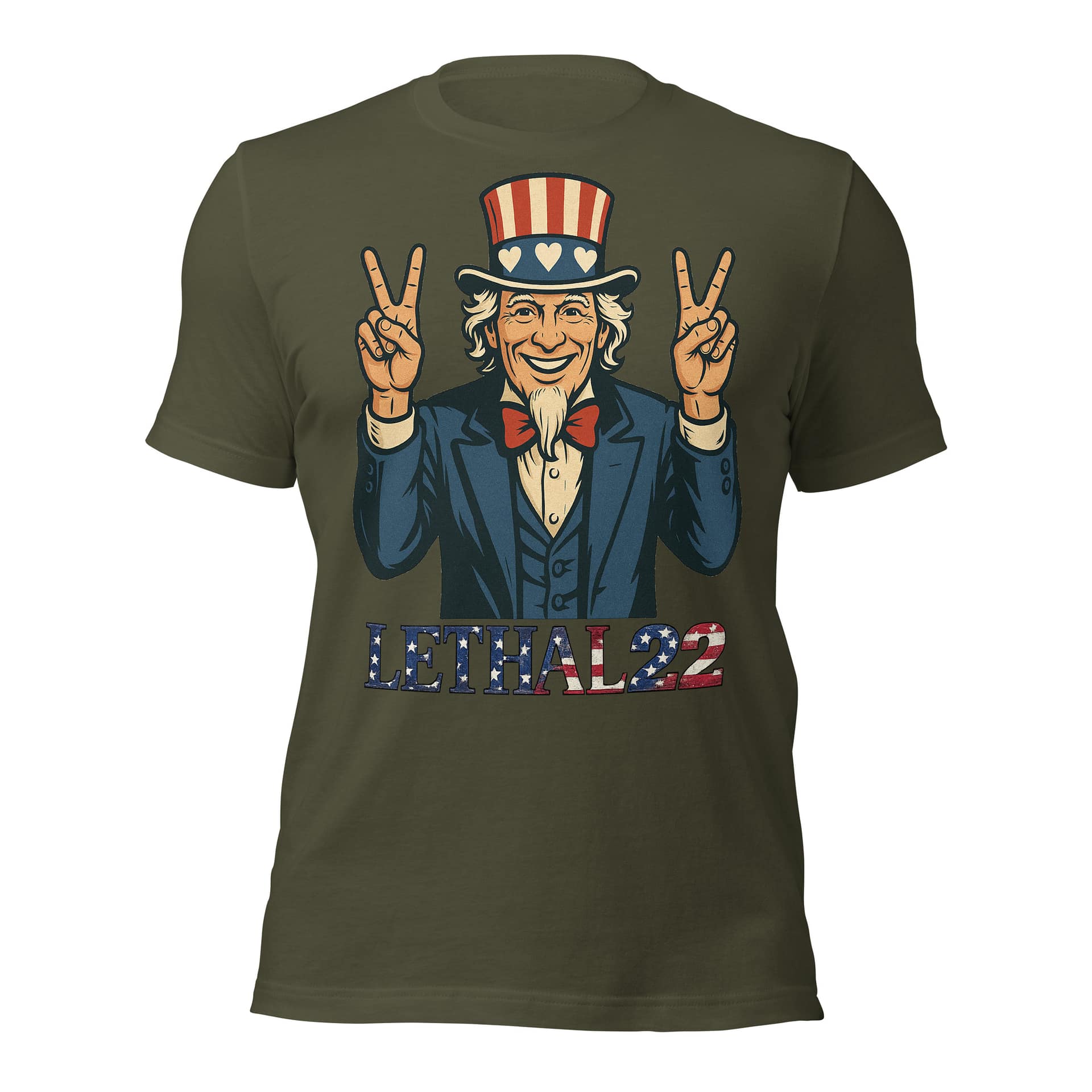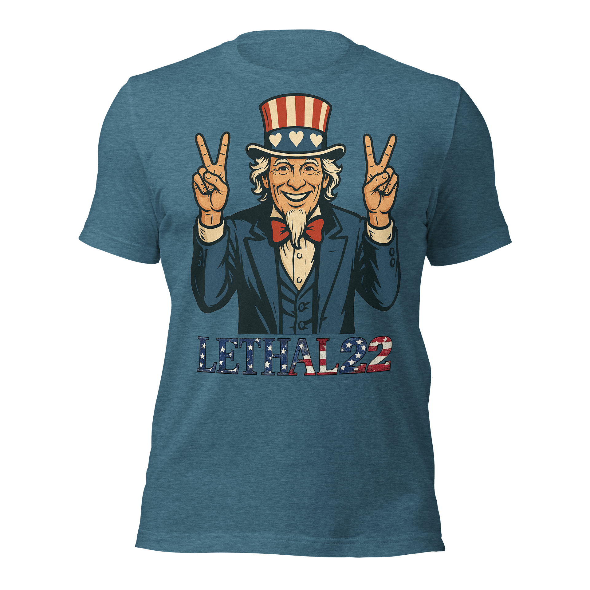 Uncle Sam raising two peace signs is a reminder that love of country does not mean blind obedience. Real patriotism means caring enough about America to demand accountability, integrity, and open dialogue.
